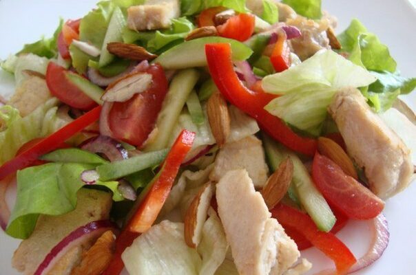 На 100 грамм всего 99.99 ккал! Б/Ж/У — 10.17/4.93/3.82 ❗ Ингредиенты: Куриная грудка — 200 Грамм Помидор — 1 Штука Огурец — 1 Штука Листья салата — По